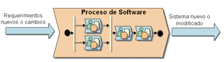 Un proceso de desarrollo de software es un conjunto de personas, estructuras de organización, reglas, políticas, actividades y sus procedimientos, componentes de software, metodologías, y herramientas utilizadas o creadas específicamente para definir, desarrollar, ofrecer un servicio, innovar y extender un producto de software.